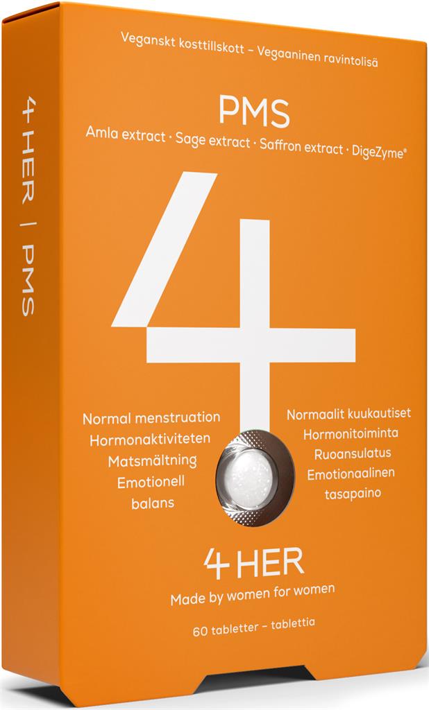 4Her PMS är ett kosttillskott för kvinnor speciellt framtagen för kvinnor med PMS-symtom som obehag, humörsvängningar och uppblåsthet. Innehåller noggrant utvalda veganska ingredienser av hög kvalitet.