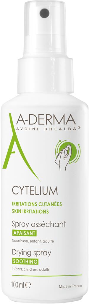 A-Derma Cytelium är uttorkande, klåddämpande och lugnande spray för röd, fuktig och irriterad hud. Den har kylande effekt, reducerar rodnad och hindrar att externa irritanter angriper huden. Använd på röd hud som vätskar sig, i fuktiga hudveck hos spädbarn, barn och vuxna, vid fuktiga skrubbsår, insektsbett och utslag.
