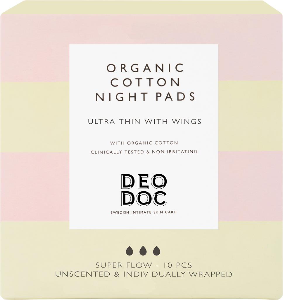 DeoDoc Organic Cotton Night Pads är en nattbinda tillverkad av ekologisk bomull. Bindan har ett toppskikt och en kärna gjord av 100 % ekologisk bomull. Bomullens mjuka och luftiga fibrer är skonsamma för intimhuden och låter huden andas för att minska irritation och lukt. Bindorna är följsamma och nattbindan är extra lång baktill för att ge ett bra skydd under natten. Passar dig som vill ha ett naturligt och skonsamt material närmast intimhuden istället för plast. Förpackningen innehåller 10 st individuellt förpackade bindor. Tillverkade i Sverige. Följ anvisningarna på produkten/bruksanvisningen.
