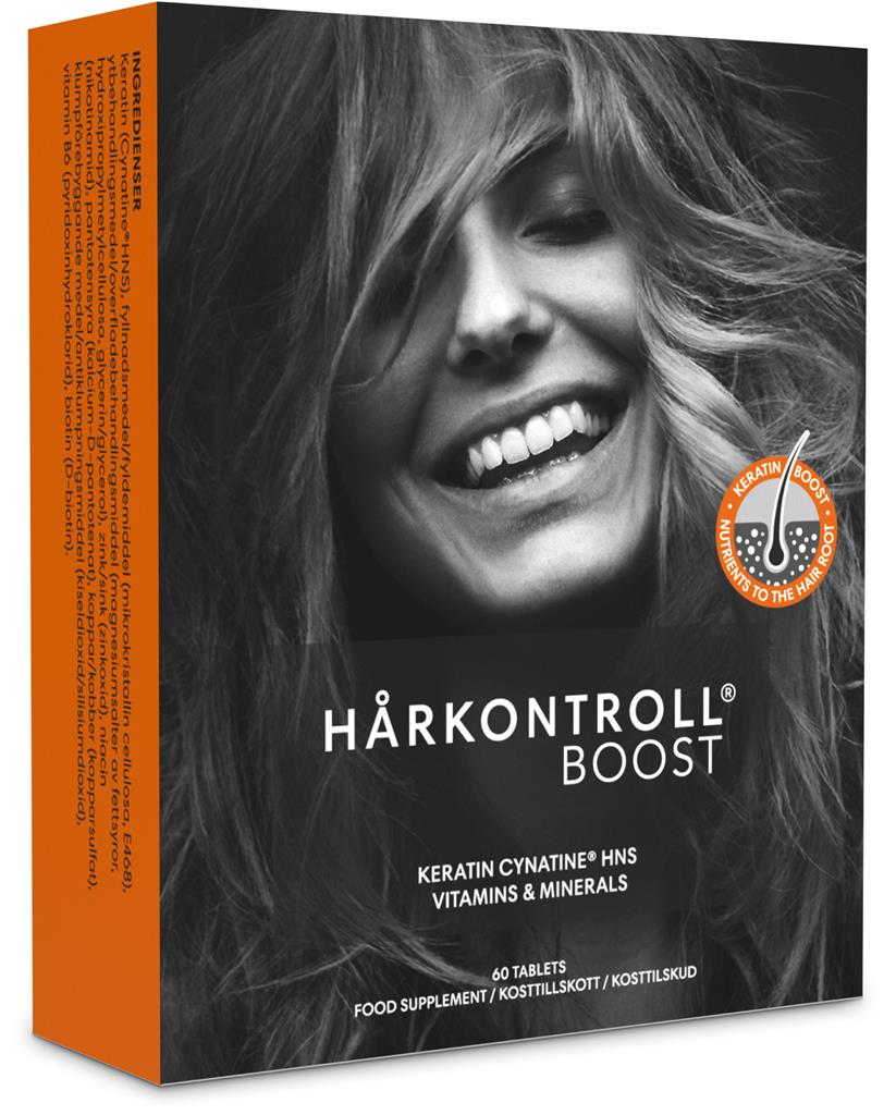 Hårkontroll Boost är ett kosttillskott för håret som innehåller det kliniskt dokumenterade keratinet Cynatine® HNS som är utvecklat för att stödja hårets normala växtförutsättningar.