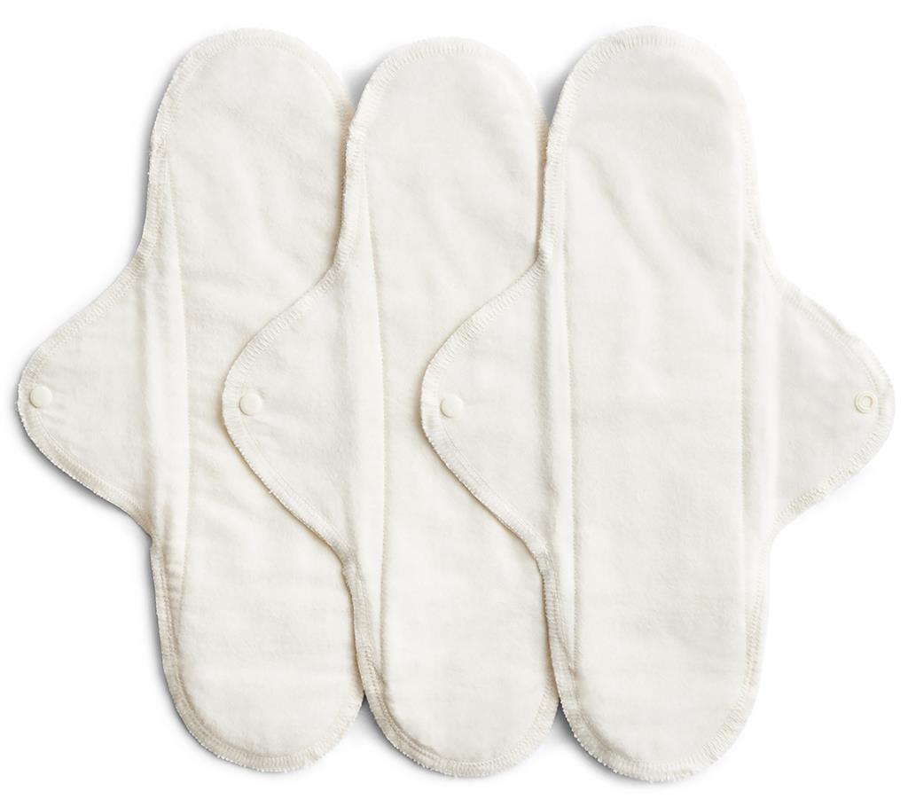 3-pack bindor i naturvit ekologisk bomull som går att tvätta och återanvända. Återanvändbara nattbindor som är skonsamma för hud och slemhinnor. Bindan har en hög absorptionsgrad och lämpar sig bra när du sover eller under dagen för dig som har rikligare flöde.