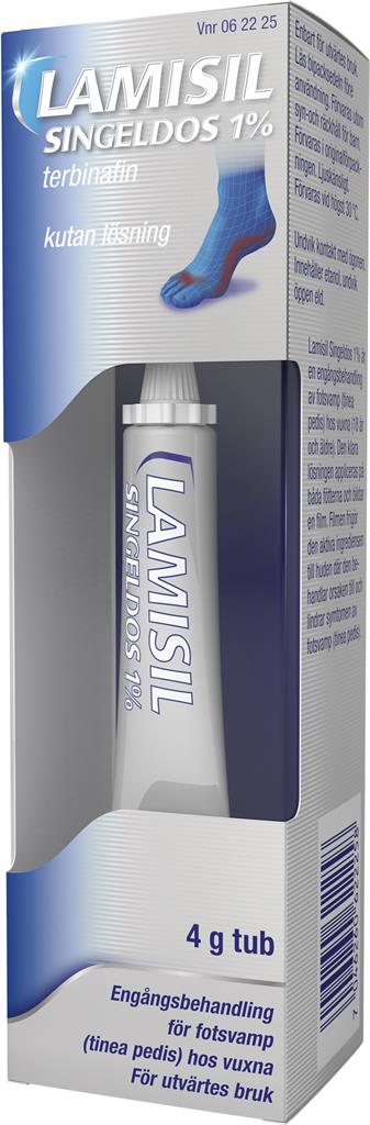 Lamisil Singeldos är en engångsbehandling för fotsvamp (tinea pedis). Den verkar genom att döda svamparna som orsakar fotsvamp. Efter behandling på fötter, lämnar den en slät och knappt synlig film som stannar kvar på huden. Via filmen överförs det aktiva innehållsämnet som behandlar fotsvamp till huden. Fotsvamp börjar ofta mellan tårna, och kan spridas till fotsulan och fötternas sidor.