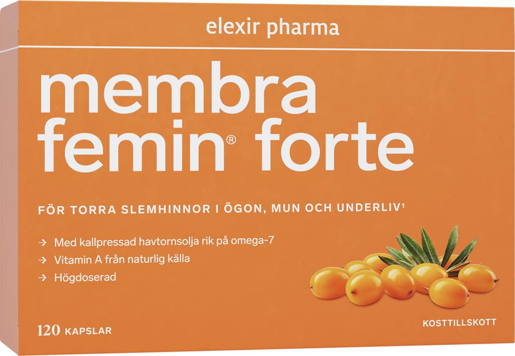 Membra Femin Forte är ett kosttillskott som innehåller havtornolja (rikt på Omega-7), A-vitamin från betakaroten, samt Quercetin och Rutin. Havtornsextrakt och vitamin A bidrar till slemhinnornas normala funktion. Vi har