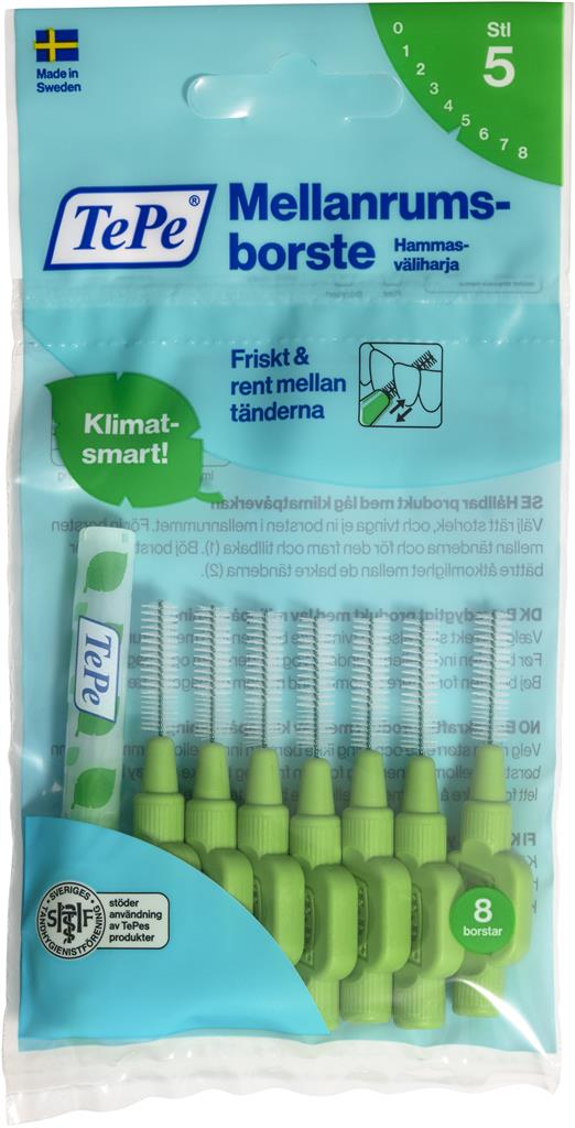 TePe Mellanrumsborste används för att göra rent mellan tänderna, där en vanlig tandborste inte kommer åt. När man regelbundet gör rent mellan tänderna kan man förebygga tandköttsinflammation, hål i tänderna (karies) och dålig andedräkt. TePe Mellanrumsborste kan också underlätta rengöringen av implantat, tandställning och brokonstruktioner. Varje förpackning innehåller 8 st mellanrumsborstar. Eftersom mellanrum varierar i storlek finns det interdentalborstar i flera färgkodade storlekar: